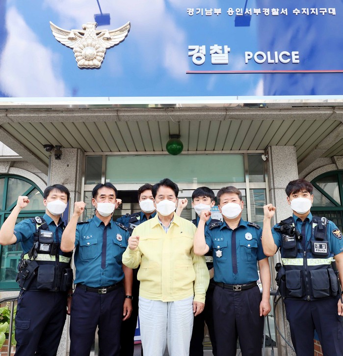 | ▲백군기 용인시장이 18일 추석 연휴에도 업무를 위해 구슬땀을 흘리고 있는 용인서부경찰서 수지지구대 관계자들에게 감사의 인사를 전하고 기념촬영을 하고 있다. 용인시 제공 |