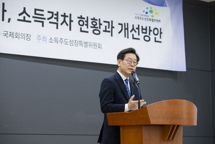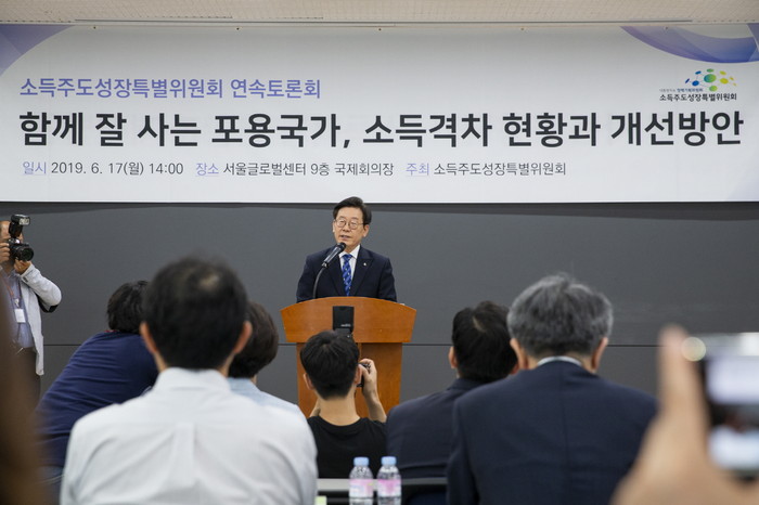 이재명 지사는 17일 오후 2시 서울글로벌센터 국제회의장에서 열린 소득주도성장특별위원회 정책토론회 기조연설을 통해 “세계은행이나 IMF에서도 포용적 성장, 분배와 재분배를 강화하는 것이 지속적 경제성장을 가능하게 하는 유일한 정책이라고 말하고 있다. 개인적으로도 소득주도 성장, 포용적 성장은 반드시 가야할 길이라고 생각한다”고 말했다.