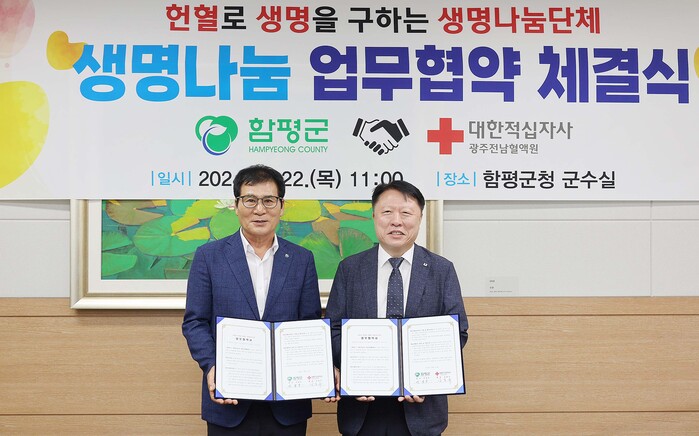 [로컬세계 = 이남규 기자] 전남 함평군과 광주전남혈액원이 헌혈문화 확산과 나눔의 사회적 가치 실현을 위한 '헌혈로 생명을 구하는 생명나눔단체 업무협약식'을 체결했다.