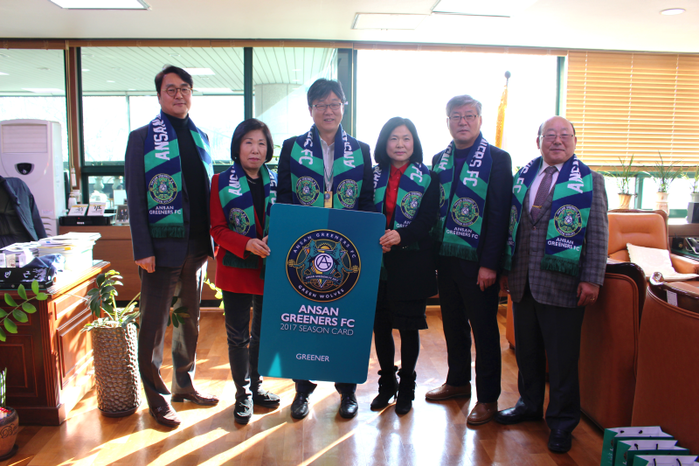17일 오전 안산시청 의장실에서는 시의회 이민근 의장, 유화 기획행정위원장, 홍순목 문화복지위원장, 이상숙 도시환경위간사와 박공원 안산 그리너스 FC 단장, 이종걸 축구협회회장 등이 모여 시즌권 구매 릴레이를 이어나가는 자리를 가졌다.