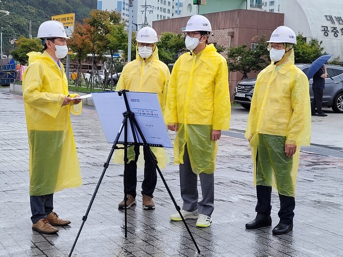 ▲ 박형준 부산시장[오른쪽 두번째]과 정종복 기장군수[오른쪽 첫번째]는 태풍 힌남노 대비해 5일 오후 4시경 대변항을 방문 점검했다. 기장군 제공 |