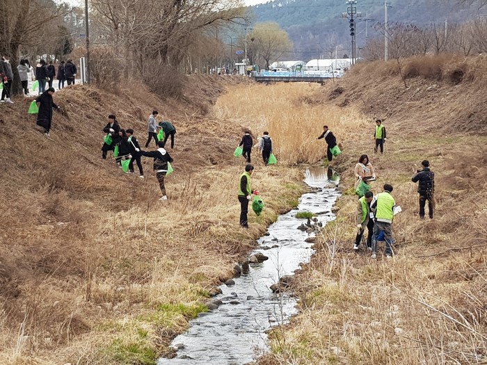 | ▲‘세계 물의 날’ 행사에 참석한 시민들이 하천 청소작업을 하고 있다. |
