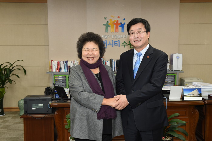 | ▲2016년 10월 수원시를 방문한 천쥐 감찰원장이 염태영 시장과 함께하고 있다. |
