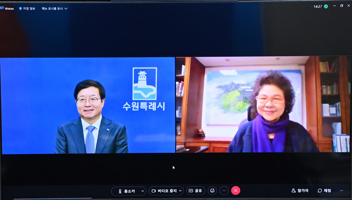 | ▲염태영 시장과 천쥐 감찰원장이 2월 8일 영상통화를 하고 있다. |