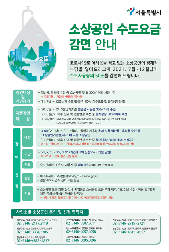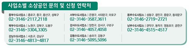 서울시 소상공인 수도요금 감면과 관련해 신청 자격, 구비서류 등 자세한 사항은 관할 수도사업소로 문의하면 된다.