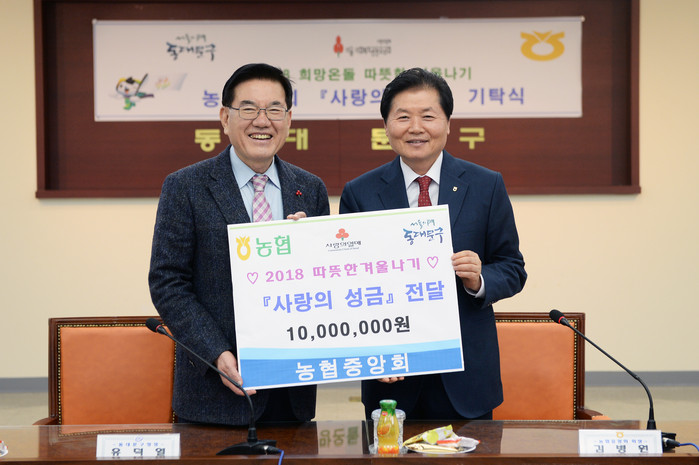 [로컬세계 임종환 기자]서울 동대문구(구청장 유덕열)는 농협중앙회(회장 김병원)가 18일 오후 4시 동대문구청을 방문해 기획상황실에서 따뜻한 겨울나기 성금으로 1000만원을 기탁했다고 밝혔다.