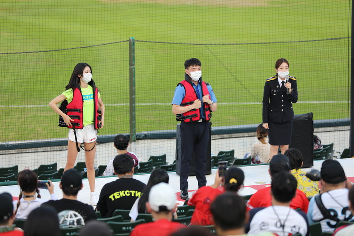 | ▲15일 부산해양경찰서는 롯데자이언츠와 키움의 야구경기를 진행하는 사직야구장에서 여름철 안전한 물놀이를 위한 캠페인을 벌이고 있다.(부산해양경찰서 제공) |