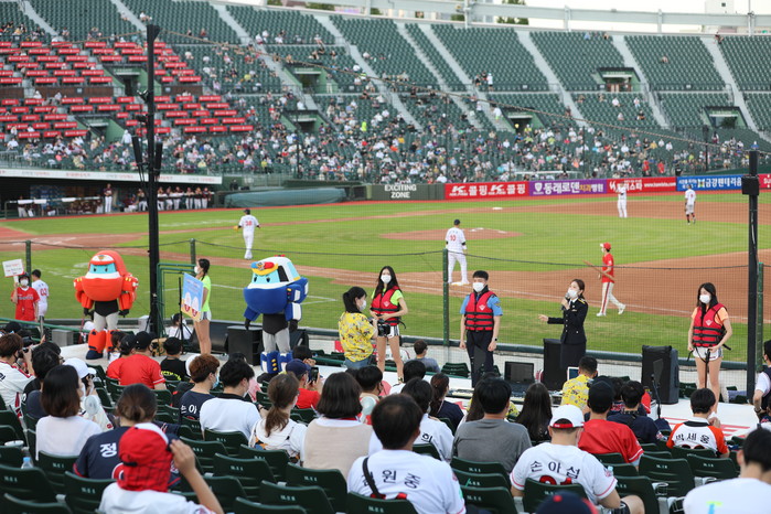 이날 사직야구장 전광판에는 여름철 물놀이 안전수칙과 구명조끼의 중요성을 강조한 영상 4편을 재생하여 자연스럽게 안전의식을 강화하였고, 야구경기 중간 브레이크 타임을 이용해 치어리더들이 직접 구명조끼를 착용하고 공연무대를 펼쳐 관중들의 이목을 집중시켰다.
