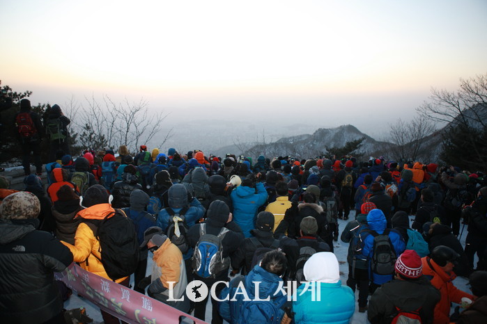 [로컬세계 전승원 기자] 1일 을미년 새해를 여는 첫날, 오전 약 7시 40분경 북한산 시단봉 동편으로 해가 떠오르자 새해의 소망들을 담은 힘찬 함성이 울려 퍼졌다.