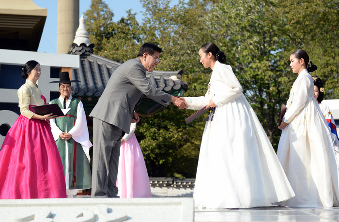 ▲22일 개최한 제3회 세종대왕 전통예술 경연대회에서 대회장인 유덕열 구청장이 시상을 하고 있다. (동대문구청 제공) |