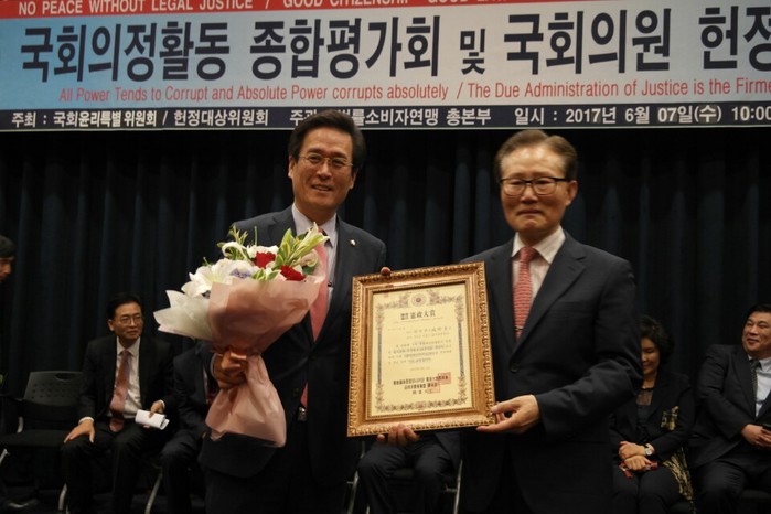 법률소비자연맹 총본부가 주관한 이번 시상은 국회의원의 의정활동에 대해 ▲본회의 재석 ▲상임위 출석 ▲법안발의 현황 ▲통과된 대표법안발의 성적 ▲국정감사 ▲상임위 소위활동 등 12개 항목을 평가해 수상자를 선정했다.