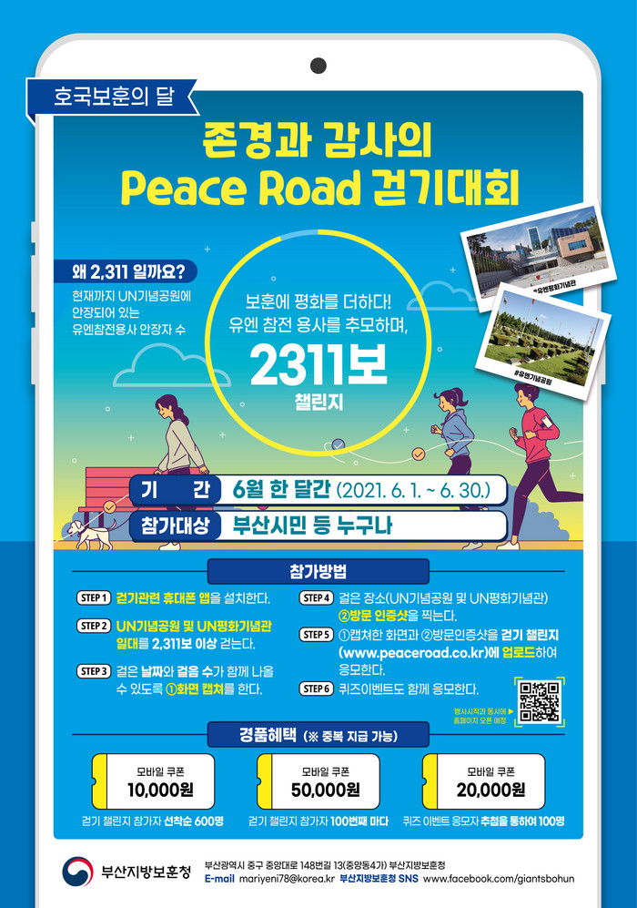 행사는 6월 1일부터 6월 30일까지 진행하며, 부산시민 등 누구나 참여 가능하다. 참가 방법은 UN기념공원 및 UN평화기념관 일대를 2,311보 이상 걸은 후 걸은 날짜와 걸음 수가 함께 나올 수 있도록 화면 캡쳐를 하고 방문 인증샷을 찍은 후, 캡쳐한 화면과 방문 인증샷을 걷기 챌린지 홈페이지에 업로드하면 된다.