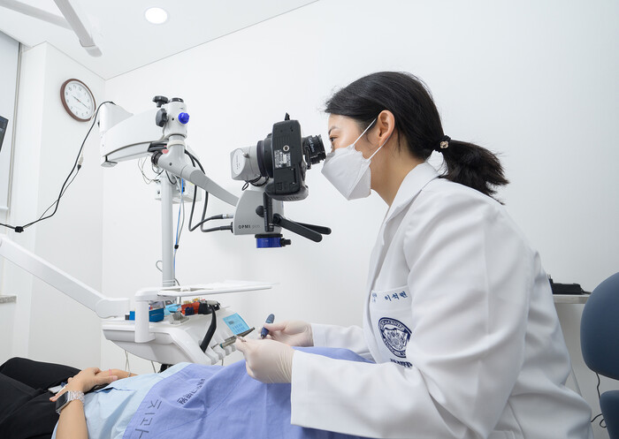 ▲강동경희대학교치과병원 보존과 이석련 교수가 환자의 치아를 검진하고 있다. |