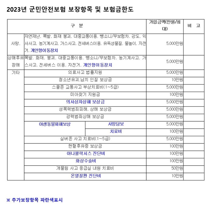 특히 올해는 낙후지역의 인구증가정책, 복지 증진 사업 등을 위하여 편성된 낙후지역특별회계 예산을 활용하여 보장 항목 및 보장금액을 대폭 확대했다. 자연재난, 농기계사고, 가스사고, 자전거 사고 등을 포함한 기존 31개 항목에서 개인형이동장치사고, 야생동물피해보상 등을 포함한 7개 항목을 추가했고, 지급한도도 당초 2천만원에서 5천만원으로 확대하여 피해군민의 생활안정에 기여할 전망이다.