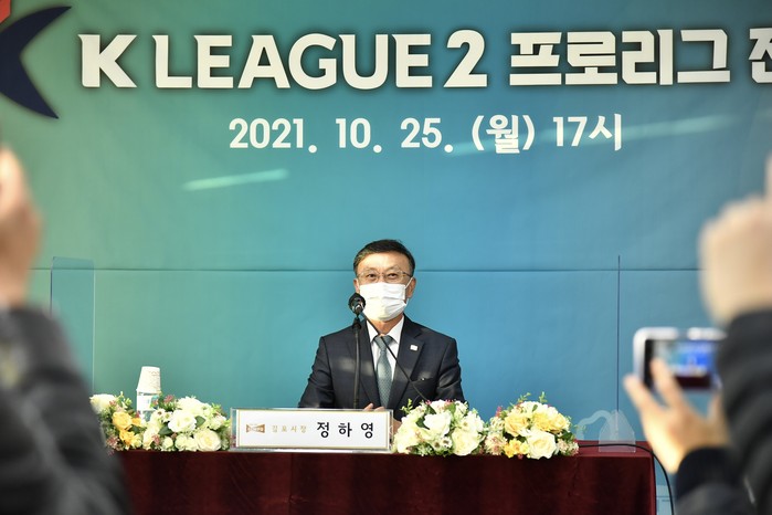 | ▲김포FC 이사장인 정하영 김포시장이 25일 열린 프로리그 진출 발표 기자회견에서 "구단 운영의 자립성과 독립성을 보장하는 것은 물론 전국 최고 수준의 전문성을 확보하도록 지원하겠다“고 밝혔다. 김포시 제공 |