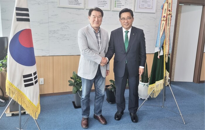 ▲ 전북대학교 신영철 명예교수 면담 사진. 한국농수산식품유통공사 김춘진 사장(우측), 전북대학교 신영철 명예교수(좌측). 한국농수산식품유통공사 제공 |