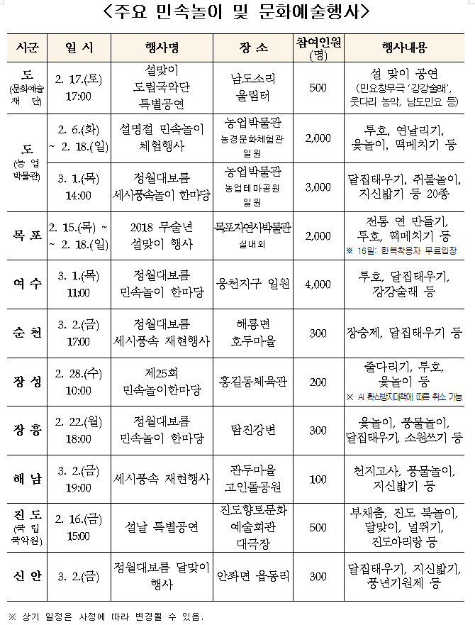 설 연휴가 시작되는 15일부터 대보름인 3월 2일 전후로 전남지역 430여 곳에서 펼쳐지는 세시풍속놀이와 문화행사는 훈훈한 명절 분위기 조성은 물론 귀성객과 관광객에게 남도의 정취를 느끼게 해줄 것으로 기대된다.