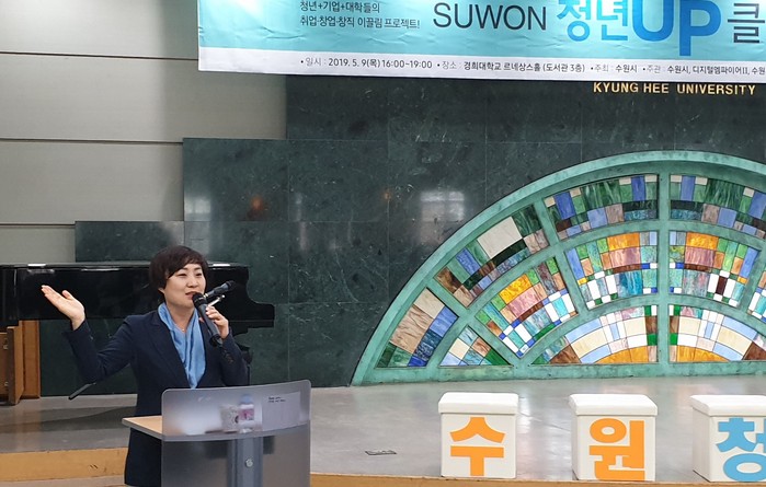 ▲안혜영 경기도의회 부의장이 9일 '2019 수원 청년UP 클라우드'에 참석해 격려의 메시지를 전했다.(경기도의회 제공) |