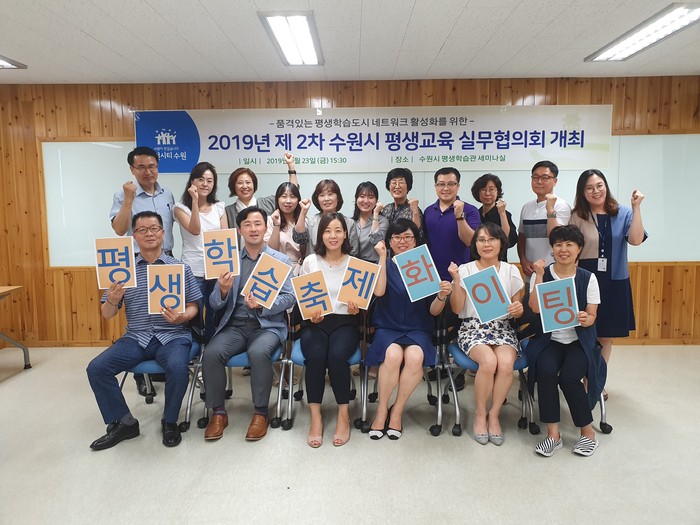 | ▲수원시 평생교육실무협의회 위원들이 기념촬영을 하고 있다.(수원시 제공) |