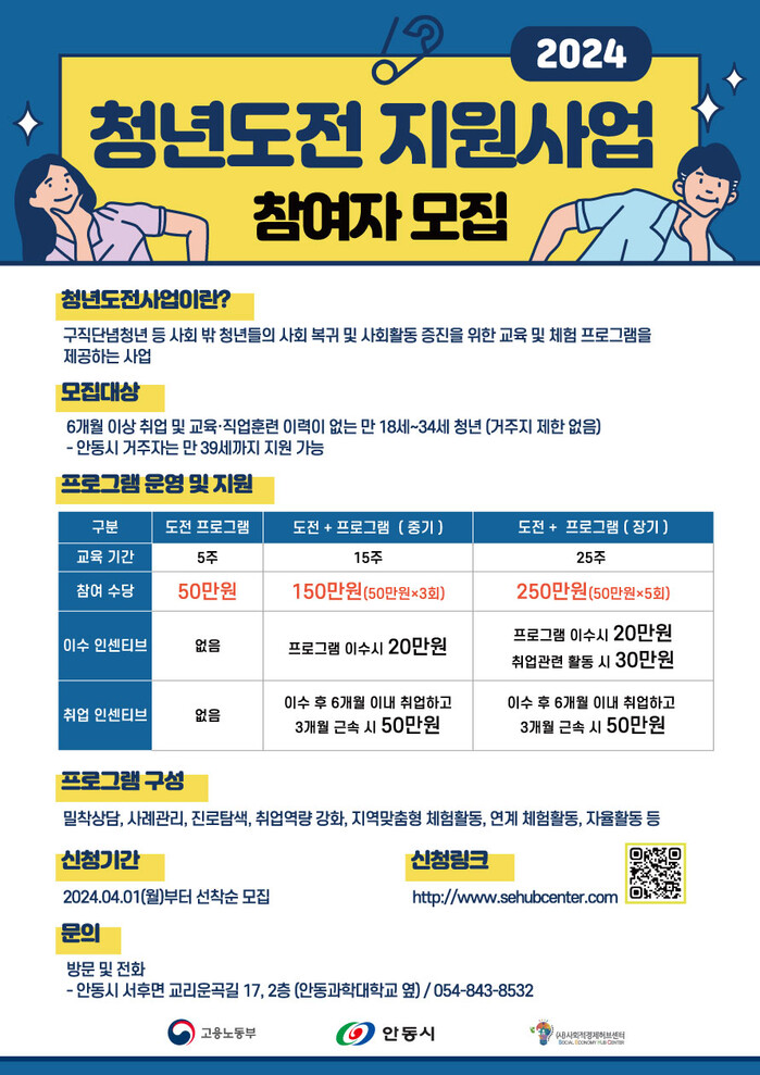 [로컬세계 = 이창재 기자] 경북 안동시(시장 권기창)는 청년의 구직의욕을 높이고 사회 진출을 돕는 ‘2024년 청년도전지원사업’ 참여자를 모집한다.