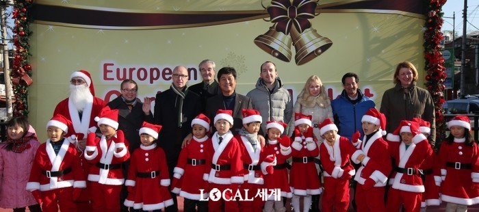 ▲ 6일부터 7일까지 유럽 정통 크리스마스 문화 축제가 김영배 성북구청장(뒷줄 가운데)과 함께 성북천 분수마루에서 펼쳐진다. 이날 주한 독일, 프랑스, 이탈리아, 스위스, 노르딕, 스페인 등 10개 유럽국가 대사관이 참여한다. © 로컬세계 |