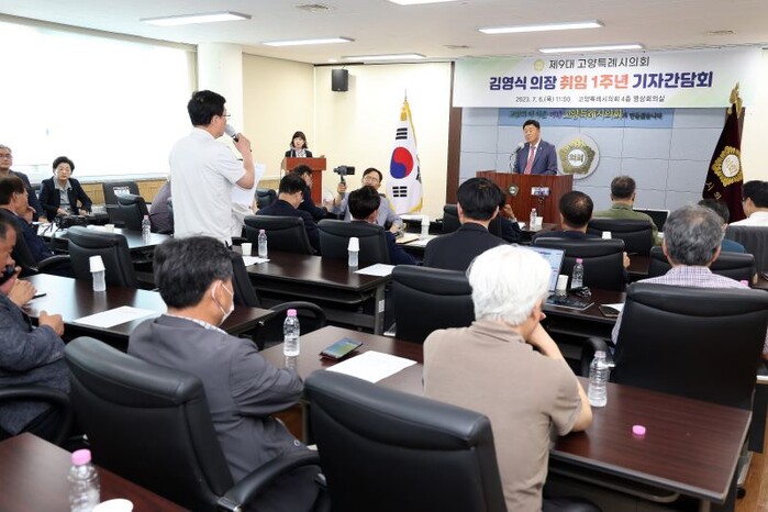[로컬세계 = 임종환 기자]경기 고양특례시의회(의장 김영식)는 6일 의회 영상회의실에서 ‘제9대 고양특례시의회 의장 취임 1주년 기자간담회’를 갖고 그동안의 의정성과와 남은 1년 의장으로서 포부를 밝혔다.