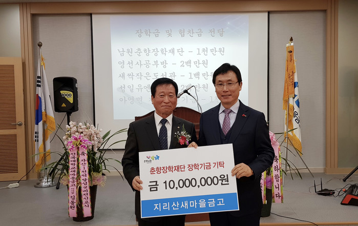 [로컬세계 이태술 기자]전북 남원시는 지리산 새마을금고에서 지역 인재양성을 위한 장학기금 1000만원을 춘향장학재단에 기탁했다고 14일 밝혔다.
