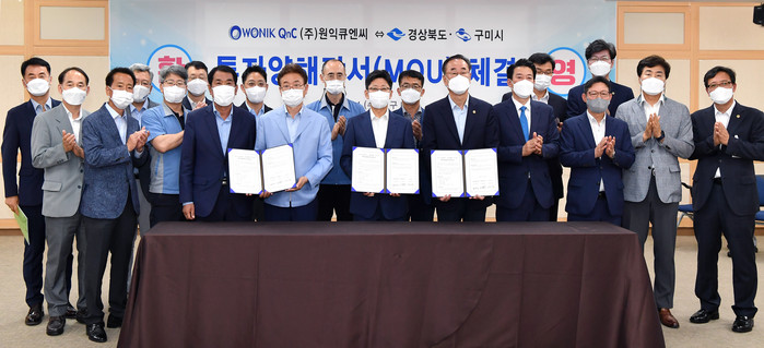 [로컬세계 이창재 기자]경북도와 구미시는 14일 구미시청 3층 상황실에서 이철우 도지사와 장세용 구미시장, 임창빈 ㈜원익큐엔씨 대표이사, 도의원 등이 참석해 ㈜원익큐엔씨의 반도체 및 디스플레이용 소재ㆍ부품 제조공장 증설 투자를 위한 투자양해각서(MOU)를 체결했다.