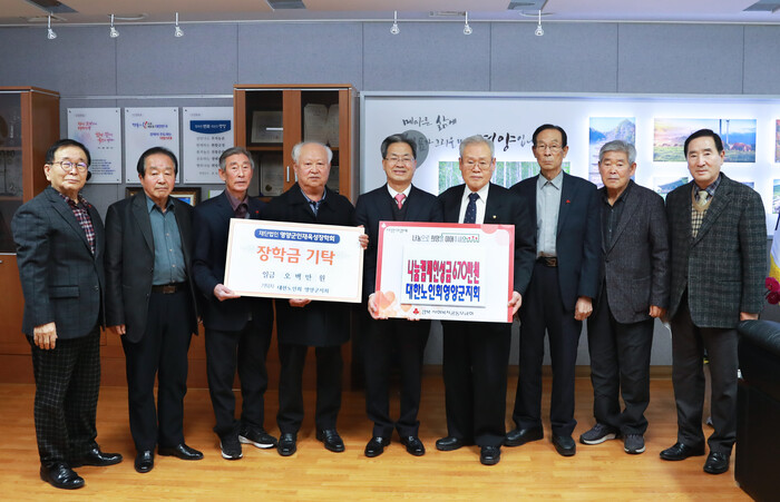▲(사)대한노인회 영양군지회(회장 안재범)는 16일 영양군청을 방문해'희망2023 나눔캠페인 성금' 및 '인재육성장학금'을 전달했다. <사진=영양군 제공> |