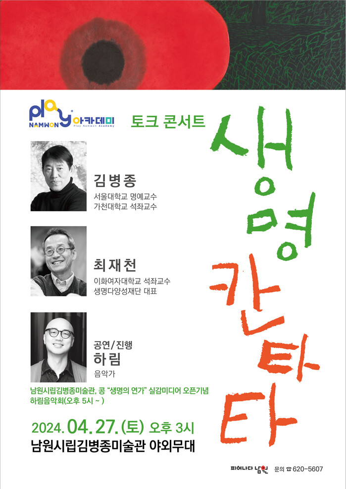 특히 이번 강연은 인문학 강연과 공연이 어우러진 Play남원 아카데미로 “생명 칸타타” 라는 주제에 맞게 남원시립김병종미술관의 자연과 함께 자연스럽고 편안한 분위기 속에서 진행될 예정이다.