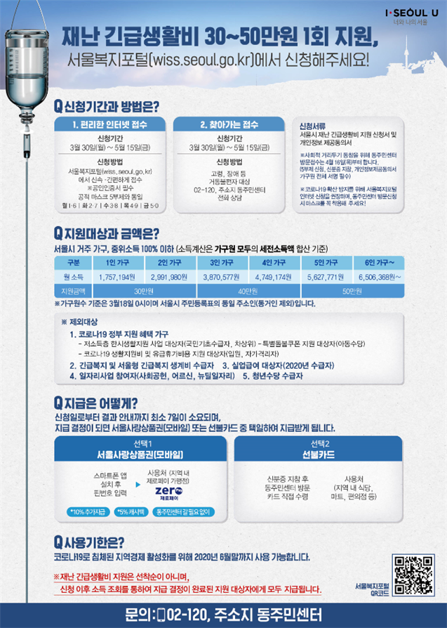 서울시가 코로나19로 타격을 입은 시민들의 생활안정을 지원하기 위한 ‘재난긴급생활비’ 신청접수를 30일부터 시작한다. 접수된 날로부터 7일 이후 모바일 서울사랑상품권 또는 선불카드로 지급된다.