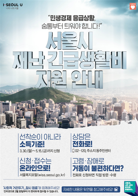 서울시 관계자는 “재난긴급생활비 지원 발표 이후 시청과 동주민센터로 매일 문의가 쏟아지고 있다. 특히 예산이 소진되기 전까지 선착순으로 지원받는지를 묻는 문의가 상당하다”며 “재난긴급생활비는 중위소득 100% 이하 가구라면 신청 순서에 관계없이 모두 받을 수 있는 만큼 온라인 5부제를 적극 활용해달라”고 당부했다.