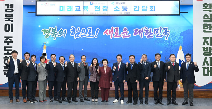 ▲ 2일 도청에서 지역 대학 위기에 따른 정책과제와 지방주도 인재양성방안 모색을 위해 국가교육위원회(이하 국교위), 교육부, 지역대학 총장, 관련분야 전문가들이 함께 하는 「미래교육 현장 소통 간담회」를 가진 후에 기념촬영하고 있다.<사진= 경북도 제공> |