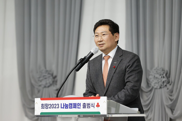 이상일 용인시장이 2일 시청 컨벤션홀에서 열린 ‘희망 2023 나눔 캠페인 용인추진단 발대식과 사랑의 온도탑 제막식에 참석해 한 말이다.