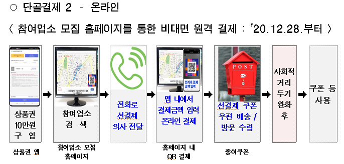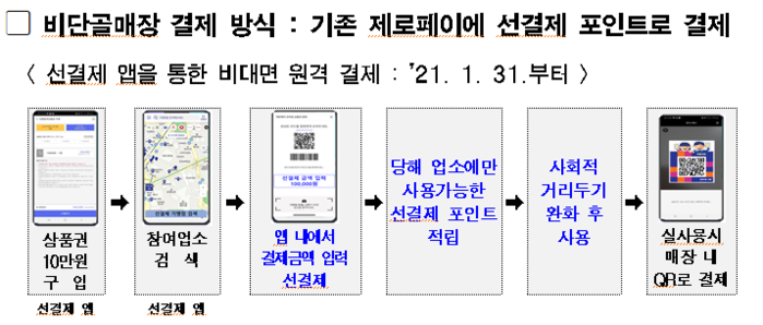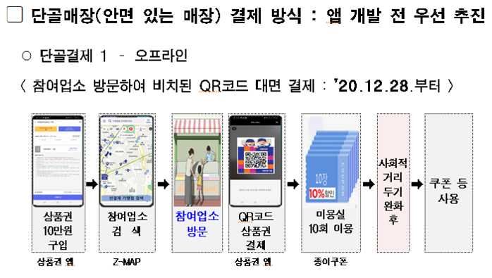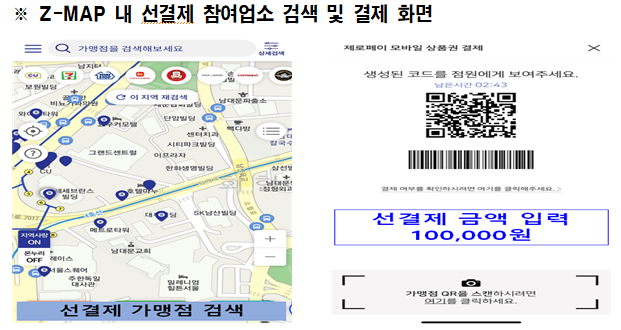현재 집합금지 및 영업제한 업종 20만개 중 제로페이에 가맹된 11만개 업소는 제로페이홈페이지을 통해, 선결제 즉시 참여가 가능하며, 제로페이에 아직 가맹이 안 된 9만개 업소는 참여를 원할 경우 제로페이홈페이지를 통해 선결제 참여를 신청하면, 제로페이 콜센터에서 별도 연락하여 가맹절차를 도와 준다.