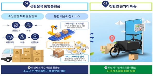 도심지 노외주차장에 주차장을 겸용하는 스마트 생활물류거점을 구축하여 ▷중소상공인 전용 풀필먼트 물류서비스*와 중소상공인 제품과 기존 택배물품의 이종 물류를 통합 배송하는 서비스를 제공하게 되며, 구축된 배송거점을 기반으로 ▷도심형 친환경 근거리 배송서비스를 실시하는 것을 핵심으로 한다.
