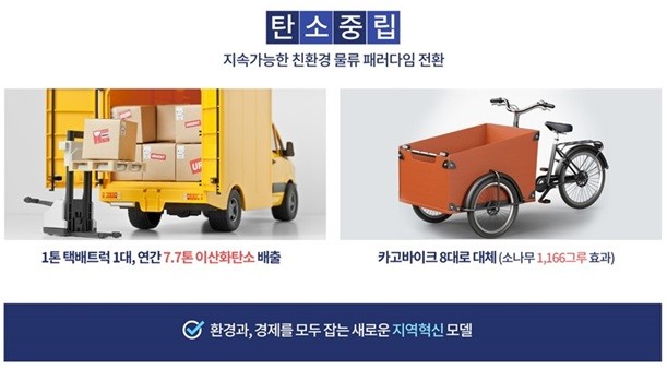 현재는 도심배송에 주로 1톤 택배트럭이 주행하고 있는데, 디젤 1톤 트럭의 경우 연간 1대당 7.7톤의 이산화탄소를 배출한다. 이를 친환경 전기자전거로 8대로 대체할 시에는 연간 소나무 1,166그루를 심는 것과 같은 효과가 발생하게 된다. 특구사업을 통해 친환경 효과와 경제성이 모두 입증될 경우 대형물류기업들이 구매하여 도심배송수단에 적극 활용한다면 효과는 더욱 배가 될 것이다.