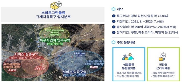 규제자유특구는 오는 8월부터 2025년 7월까지 4년간 총 290억 규모의 예산으로 경북 김천시 구도심과 혁신도시 일원에서 11개의 첨단물류 혁신기업이 참여해 진행할 예정이다.