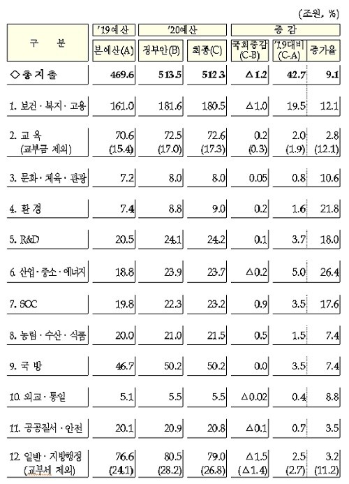 정부는 예산안이 국회를 통과함에 따라 오는 13일 임시 국무회의를 열고 ‘2020년 예산 공고안 및 배정계획’을 의결할 계획이다.