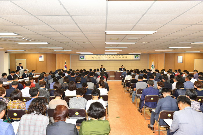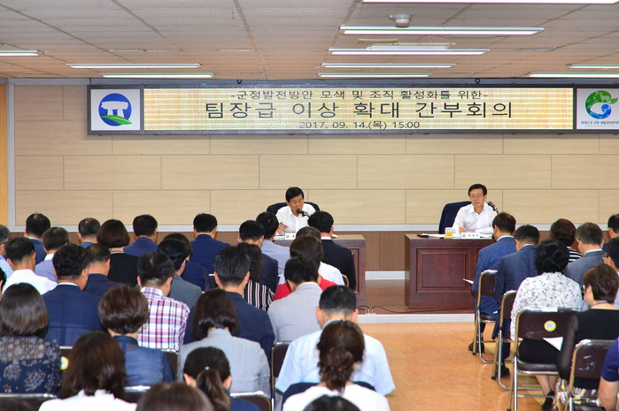 이날 군청 회의실에서 열린 확대 간부회의는 실과소장 및 팀장을 비롯한 읍면 부읍.면장과 팀장급 공무원이 참석한 가운데 20개 실과소 98개팀에서 제출한 100개의 토의안건 중 신뢰받는 지역통계업무 활성화, 도시가스 미 공급지역 지원방안, 고창군 브랜드 통합 마케팅 실시 등 11개 안건에 대한 설명과 자유로운 의견 제시로 열띤 토론회가 진행됐다.