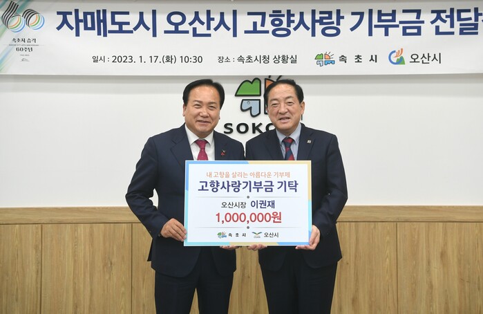 [로컬세계=김병민 기자]경기 오산시는 17일 이권재 시장이 자매도시인 강원도 속초시를 찾아가 고향사랑 기부금을 기탁했다고 밝혔다.