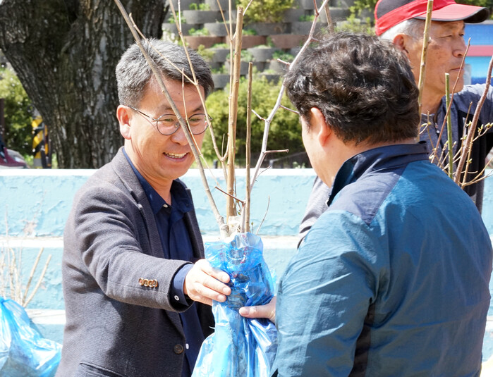 ▲나무를 나눠주고 있는 전영기 군의장 |