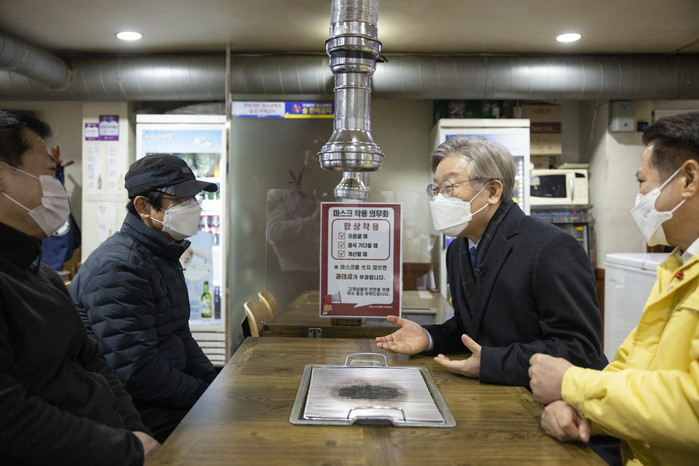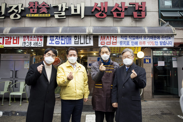 이재명 지사는 1일 소상공인 위기 극복 상생협력 우수사례인 안양시 동안구 귀인동 먹거리촌을 방문해 최대호 안양시장, 노상규 먹거리촌상인회장과 함께 소상공인이 겪는 어려움을 듣고, 지역화폐로 참치와 장어, 생고기 등을 포장 구입하는 등 생업을 이어가는 소상공인을 격려했다.