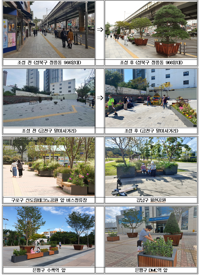 ‘움직이는 공원’은 장소 제약이 없는 새로운 형태의 공원서비스다. 버스정류장, 지하철역 앞, 보도, 광장, 공터 등 인구 유동량이 많지만 콘크리트나 아스팔트 때문에 나무를 직접 심거나 심을 공간이 마땅치 않은 다양한 장소에 바닥공사 없이 설치할 수 있다.
