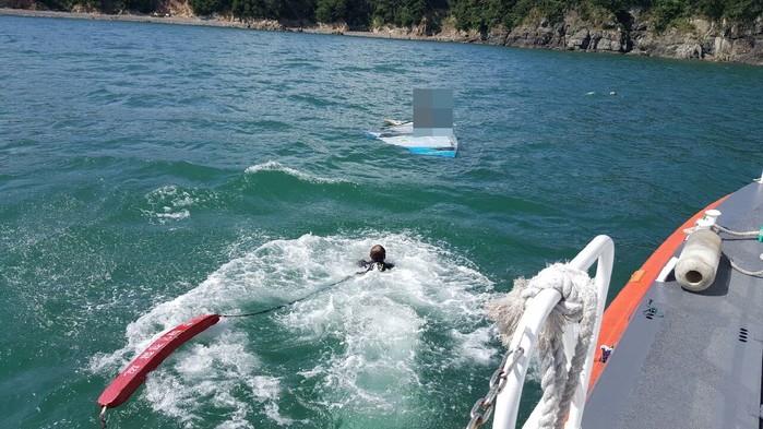 ▲부산해양경찰서 다대파출소 연안구조정이 해상 순찰 중 발견해 구조 중인 현장. 부산해양경찰서 제공 |