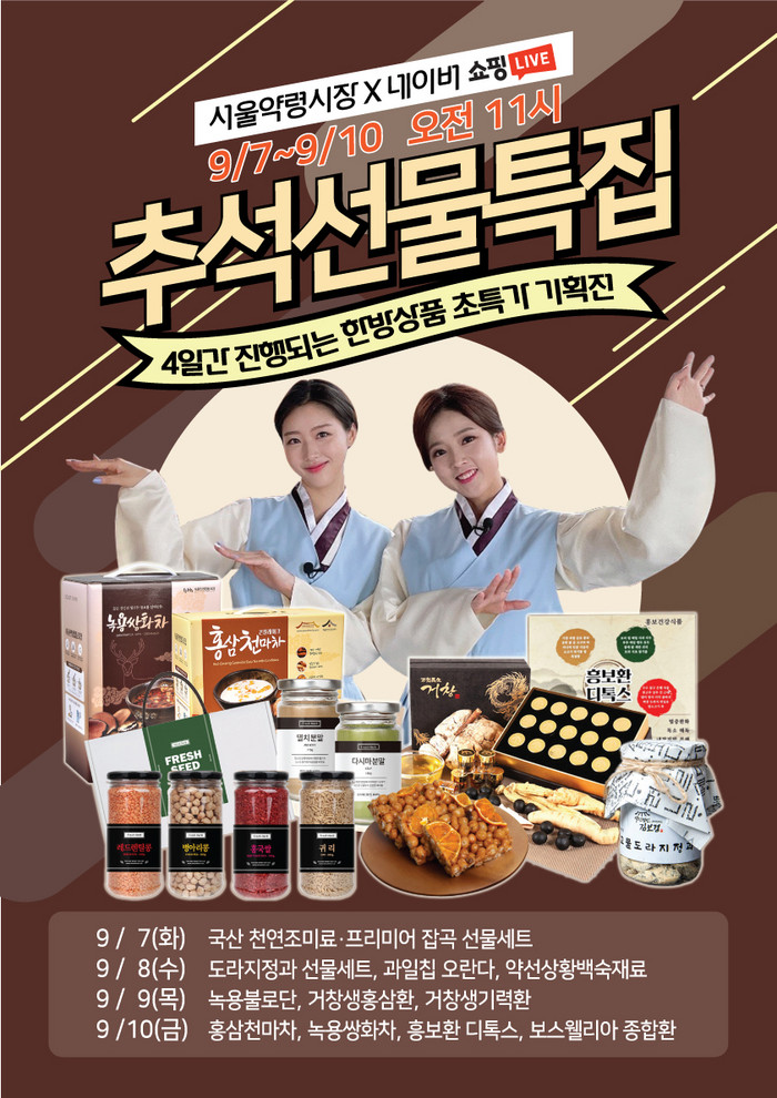 [로컬세계 임종환 기자]서울 동대문구 서울한방진흥센터(서울약령시한의약박물관)는 추석을 맞아 서울약령시의 우수한 한방제품을 저렴한 가격에 살 수 있는 ‘네이버 쇼핑라이브 기획전’을 운영한다.