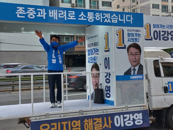 ▲이강영 시의원후보가 19일 부산 남구 문현로터리 인근 아파트단지 밀집지역 앞 도로변에 '존중과 배려로 소통하겠습니다'라는 슬로건을 부착한 유세차 위에서 손을 흔들며 선거유세를 하고 있다. |