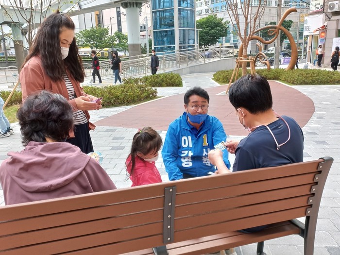 ▲19일 문현동 한화아파트단지 앞 긴 벤치앞에 쪼그리고 앉은 이강영 시의원후보가 산책나온 가족과 논높이를 맞추며 낮은 자세로 자신의 공약을 홍보하고 있다. |