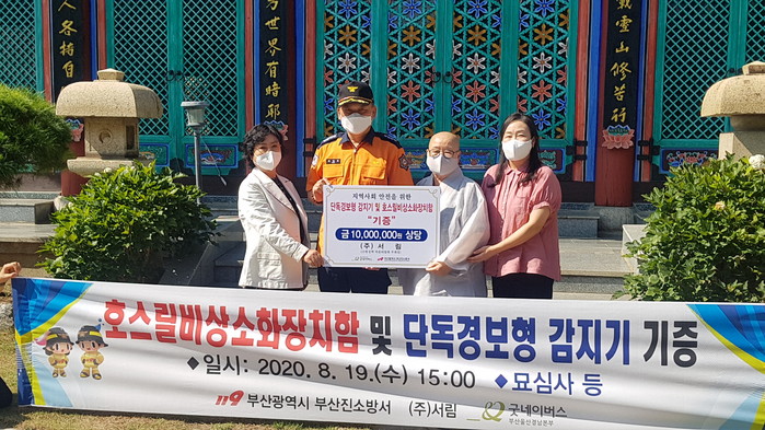 [로컬세계 맹화찬 기자]부산진소방서는 19일 오후 3시 동구 소재‘묘심사’에서 동구청장, 시의원, 구의회의장, 구의원, 소방정책자문위원이 참석한 가운데 1,000만원 상당의 소방시설(호스릴 비상소화장치함 및 단독경보형감지기) 기증식 행사를 가졌다.