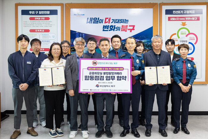[로컬세계 부산=김의준 기자]부산 북구는 지난 26일 북구청에서 부산북부경찰서, 부산교통공사 제2운영사업소 및 제3운영사업소와‘공중화장실 내 불법촬영카메라 합동점검’을위한 업무 협약을 체결했다고 30일 밝혔다.